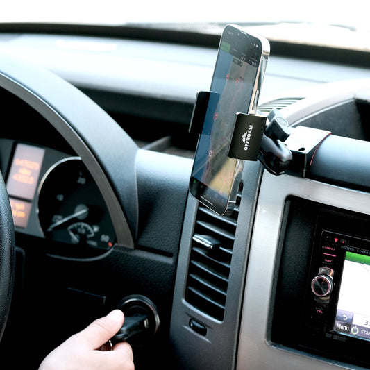Offroam phone mount positions your phone in a perfect spot without blocking the view, controls, or air flow. Shaped to fit the dashboard for secure attachment. Phone holder tuned for off-road trails with mechanical or high force magnets with wireless charging options. Durable all-metal construction. Simple install with patented design.