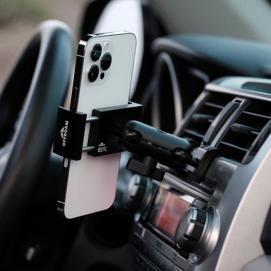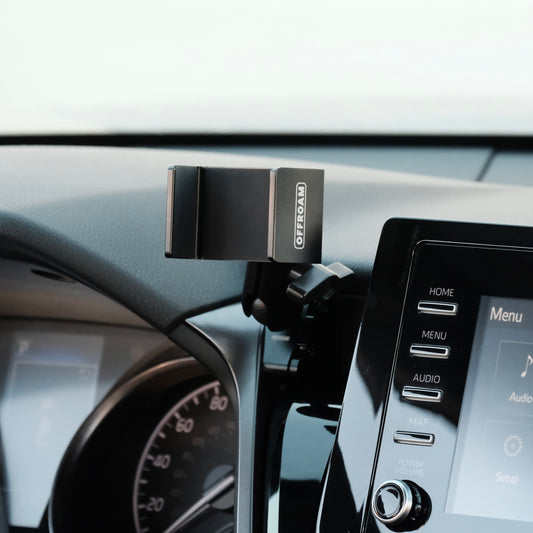 The Offroam phone mount is designed specifically for your Toyota truck, whether it's Toyota 4Runner, Toyota Tundra or Toyota Tacoma. The Offroam vehicle-specific mount is sturdy (no more wiggly phone!) and its aesthetically clean design complements your car’s interior. Installation is easy and takes all of 2 minutes - you will use the provided L key to tighten the Offroam airvent clamp in your Toyota Tacoma, Toyota Tundra or Toyota 4Runner. Our patent-pending airvent clamps include a rubber liner that prevents damage to the dash vent - so you can remove the clamp at any time. The Offroam phone mount enables mounting of your phone that doesn't block your field of view while driving.
